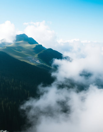 Stunning mountain landscape featuring dramatic clouds atop lush green peaks, inviting exploration and adventure in a serene and picturesque outdoor setting.