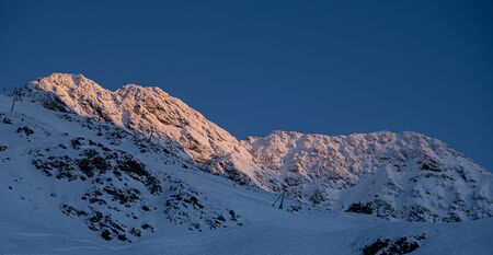 Glowing snowy mountains during sunset in the Austrian Alps.
