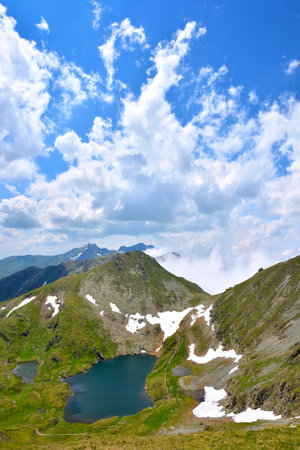 Detail of a moutain lake and clouds at high altitude in Fagaras Mountains, Romania. Location: Balea Lake.