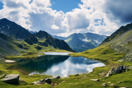 mountain landscape with remote lake in summer. travel nature background of romania on a sunny day. scenic view of clouds on a blue sky above fagaras ridge. vacation season in europe. serene wilderness