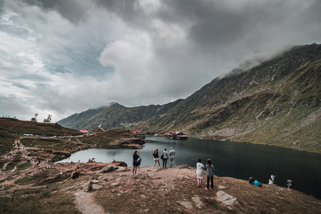 A group of tourists enjoying the scenic view of Balea leak in Sibiu County, Romania