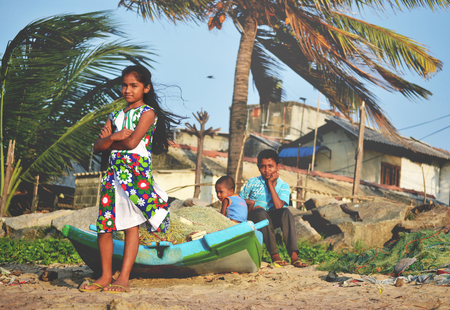 NEGOMBO, SRI LANKA, February 2013: Children Standing on the Beach around the Boat.