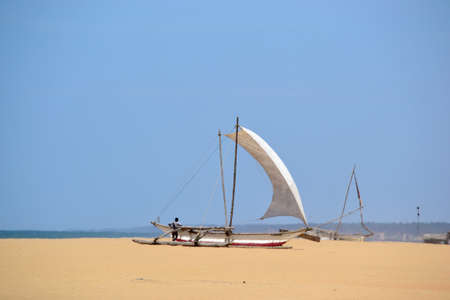 Fishing boat on Sri-Lanka.Aboriginal boat on the sandy shores.Fisherman's Catamaran on the Beach.Ocean coast in the tropics.