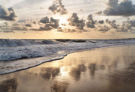 Sea splashing waves in the setting sun background with beautiful cloudy sky reflection in the water. Travel and tourism concept. Nature background. Great wallpaper design. Copy space.