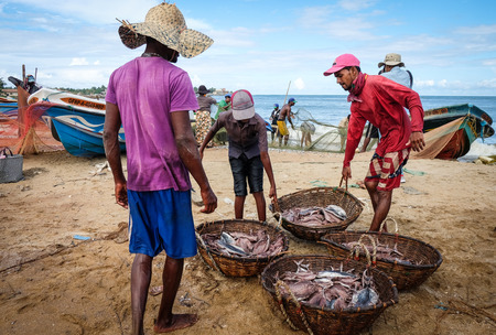 Colombo, Sri Lanka - Sep 5, 2015. Fishermen at fishing market in Colombo, Sri Lanka. Colombo is the commercial capital and largest city of Sri Lanka, with a population of 5.6 million.