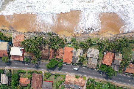 natural aerial drone bird view day shot of the sea shore with a road, beautiful villas, green trees, yellow sand, turquoise blue water, big waves and foam crashing on the beach. Pitiwella, Sri Lanka