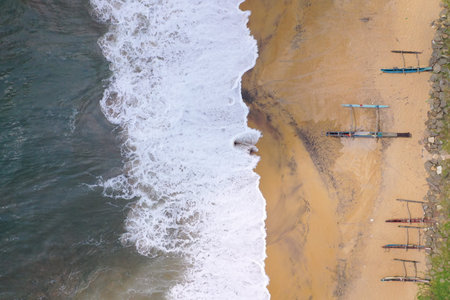 aerial drone bird view shot of the sea shore with turquoise water, an empty yellow sand beach with fishing long boats, white waves and foam forming beautiful textures, patterns, shapes. Sri Lanka