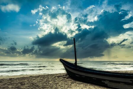 Beach before storm. Negombo, Sri Lanka. cloudy and dramatic sky. sunlight on the beach with boats and hut