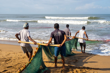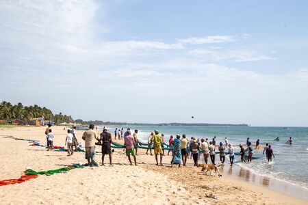 Trincomalee, Sri Lanka - August 20, 2018: Group of fishermen hauling in a big fishing net at Uppuveli Beach
