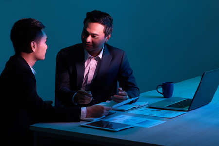 Business team of two multiethnic businessmen people in formalwear sitting together at office desk with laptop, paper documents, digital tablet and discussing new project or business idea.