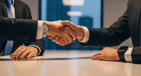 Business meeting in a modern office space with professionals discussing strategies and building connections during a handshake