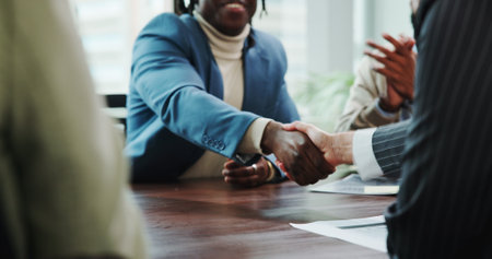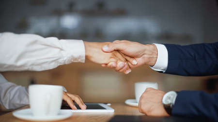 Close up of Business people shaking hands, finishing up meeting, business etiquette, congratulation, merger and acquisition concept