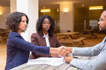 Serious diverse business partners closing contract. Business man and women sitting in cafe and shaking hands over table with documents. Partnership concept
