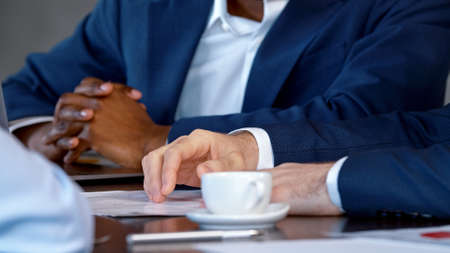 Close up shot of male businessman ceo boss proposing staff to share opinions on meeting, mentor or coach explaining training programme to group of interns, manager offering deal to diverse customers