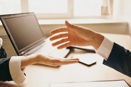 Business handshake at meeting or negotiation in the office. Partners are satisfied because signing contract or financial papers