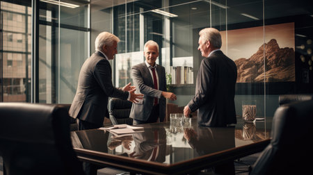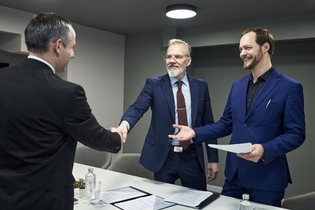Caucasian middle aged man in suit shaking hands on business deal with senior executive, while young male colleague is holding documents in office meeting room during corporate negotiations