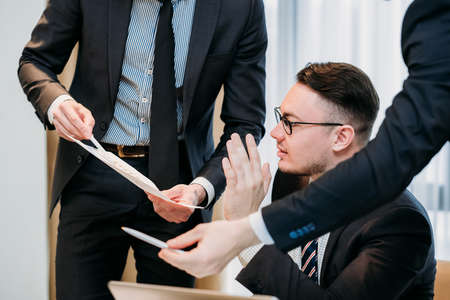 A team of young businessmen in suits working and communicating together in an office. Corporate businessteam and manager in a meeting.