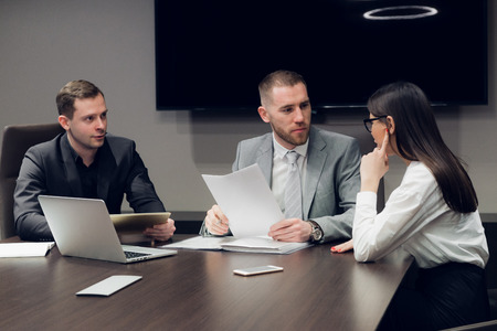 Business partnership. Corporate meeting. Strategy planning. Business people discussing project at modern conference room.