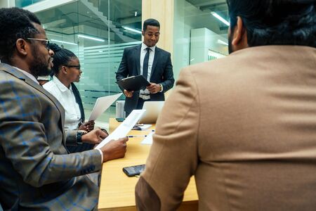 well-dressed business afro american men making a report to subordinate employees in a modern office.