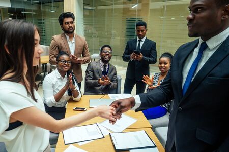 Positive handsome young Afro-American businessman sitting in circle of like-minded people and handshaking with Asian lady while meeting new people into business group