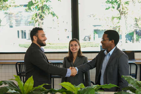 Young business asian people shaking hands in the office. Finishing successful meeting.