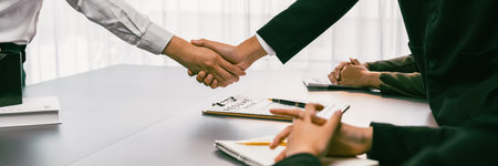 Successful job interview at business office end with handshake as the hired candidate seals the deal with the HR team recruiter by handshaking after successful interview. Panorama shot. Prodigy