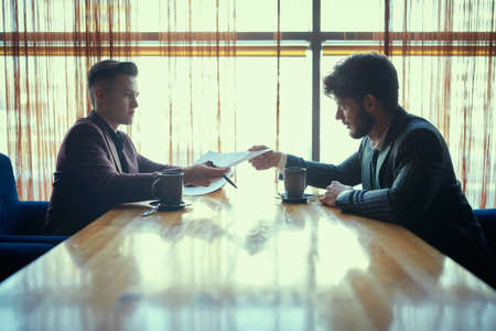 Business negotiations, business meeting. Two businessmen are discussing the details of a deal sitting at a table in a restaurant.
