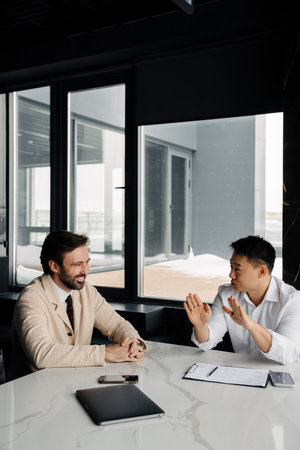 Adult asian businessman in white shirt talking to his smiling partner in modern office building