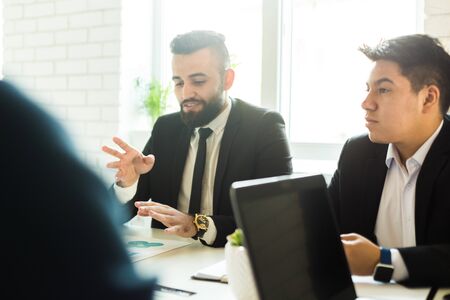 Young businessman in suit examining contract and discussing it with his partner at table at meeting
