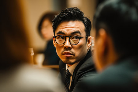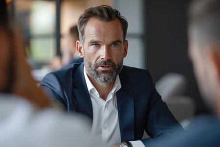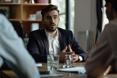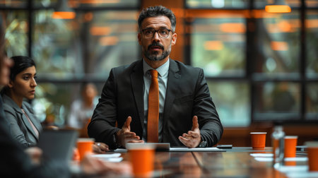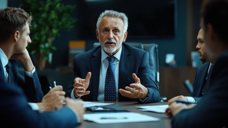 A serious business meeting showcases a focused discussion between professional colleagues in an office setting, highlighting leadership and teamwork dynamics.