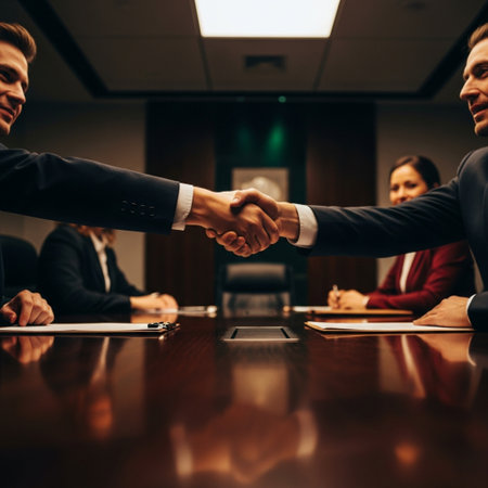 Executives in sleek boardroom; one extends congratulatory handshake.