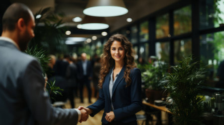 A professional young woman in a business suit shakes hands with a male colleague in a bustling, plant-filled office space, embodying teamwork and success.