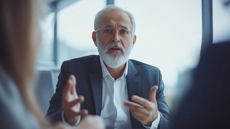 Senior politician gesturing while explaining his point of view during meeting