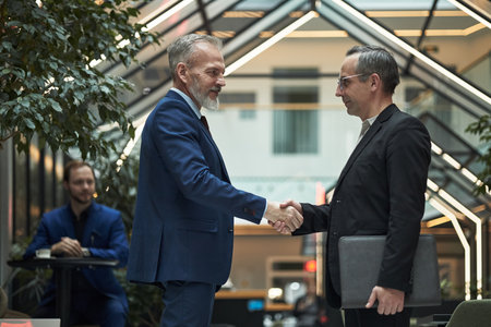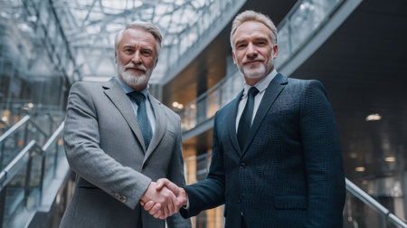 Two mature men in formal business attire shake hands inside a modern architectural space, reflecting confidence, trust, and teamwork in professional settings.