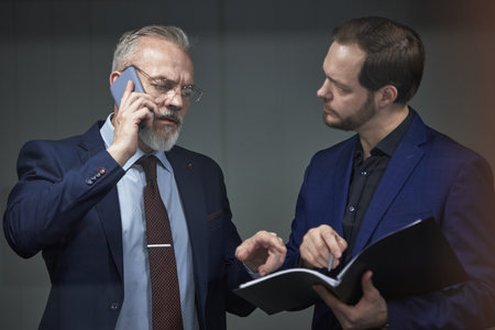 Middle aged Caucasian male executive talking on smartphone while standing next to young partner holding open folder, both discussing business documents in office setting