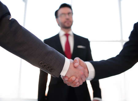 Close up view of business partnership handshake concept.Photo of two businessman handshaking process.Successful deal after great meeting.