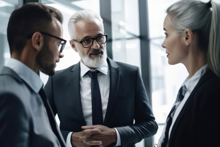 Business people collaborate in a sleek office building, displaying determination and professionalism while discussing important matters in a dynamic atmosphere.