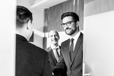 Group of confident business people greeting with a handshake at business meeting in modern office. Closing the deal agreement by shaking hands. Black and white image.