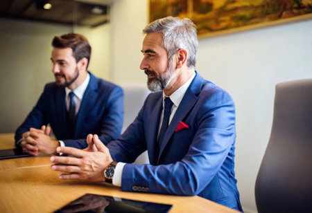 Two business professionals, sharply dressed in suits, are focused on an important discussion.