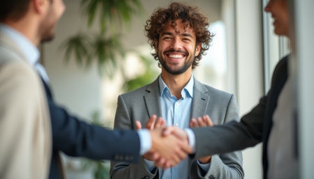 A joyful young man with curly hair smiles broadly as he shakes hands with two colleagues in a modern office setting. The atmosphere is filled with positivity and collaboration, highlighting the excitement of new partnerships and teamwork.