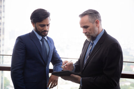 Senior businessman standing talking with partner and looking digital tablet together at office, manager discussing and meeting about project with consultant professional, business concept.