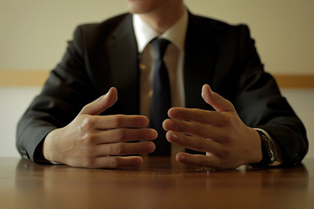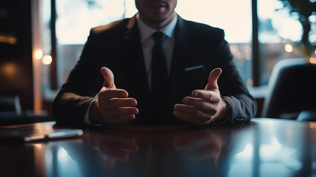 businessman sitting at the table and giving speech with his hands together, close up