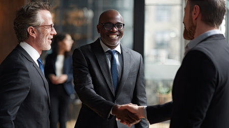 Three professional men engage in a warm handshake during a business meeting in a modern office. Their confident expressions reflect collaboration and trust.