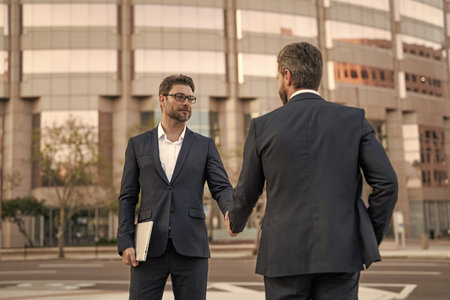 Partnership success. Celebrate business partnership. Two businessmen partner celebrating business deal. Successful partnership in business deal. Businessmen dealing outdoor. Congratulating