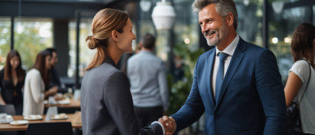 Business professionals engaging in friendly handshake, showcasing collaboration and networking. atmosphere is positive and lively, reflecting successful meeting