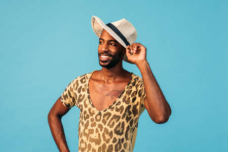 Smiling happy american african man wear stylish hat on white background. Festive and party concept