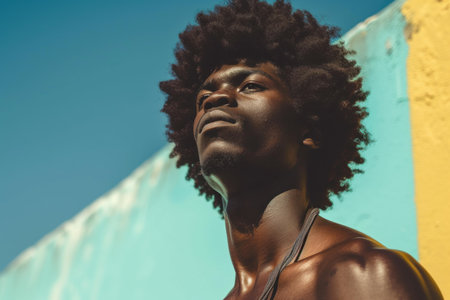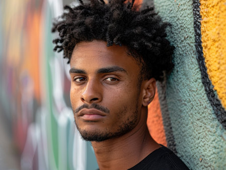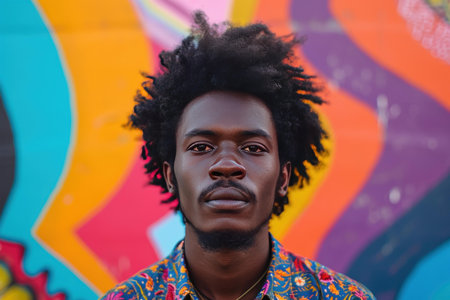 A compelling portrait of a young African man, dressed casually in a white shirt, displaying confidence and calm against a vibrant, colorful urban backdrop.