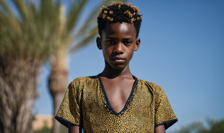 A young boy stands in front of a palm tree, wearing a patterned shirt