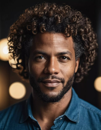 A man with striking curly hair sports a confident smile in a warm ambient setting, illuminated by soft lighting that enhances his features.