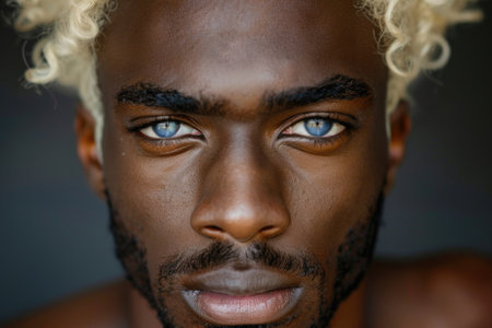 Close-up portrait of a man with striking blue eyes and contrasting hair colors AI